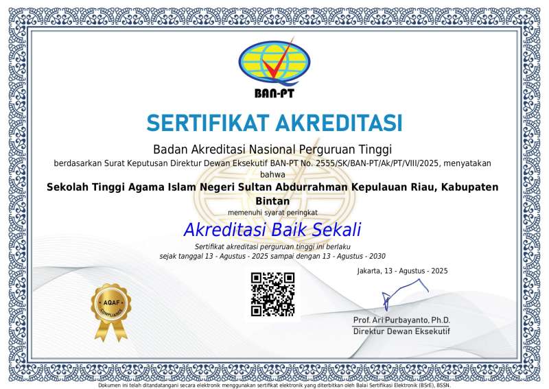 Bintan, Kampus Bersendikan Wahyu Berteraskan Ilmu — Sekolah Tinggi Agama Islam Negeri (STAIN) Sultan Abdurrahman Kepulauan Riau berhasil meraih peringkat akreditasi Baik Sekali dari Badan Akreditasi Nasional Perguruan Tinggi (BAN-PT). Keputusan ini tertuang dalam Surat Keputusan Direktur Dewan Eksekutif BAN-PT Nomor 2555/SK/BAN-PT/Ak/PT/VIII/2025. Sertifikat akreditasi tersebut berlaku sejak 13 Agustus 2025 hingga 13 Agustus 2030.